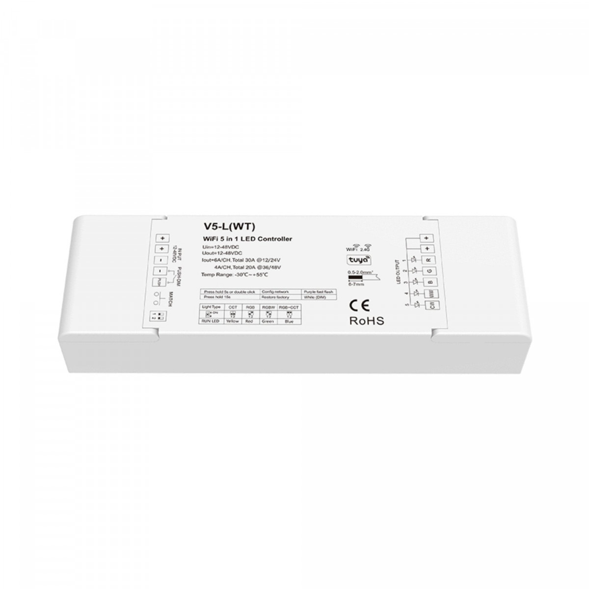 - Ampia compatibilità: supporta strisce LED monocolore, CCT, RGB, RGBW e RGB+CCT da 12-48V, con uscita 5×6A (12-24V) o 5×4A (36-48V).