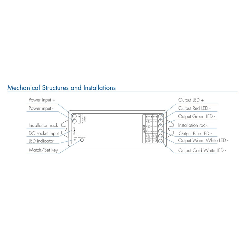 Questo dispositivo consente di gestire strisce LED monocolore, CCT, RGB, RGBW e RGB+CCT da un unico controller, combinando il controllo WiFi e RF 2,4GHz in un fattore di forma compatto.