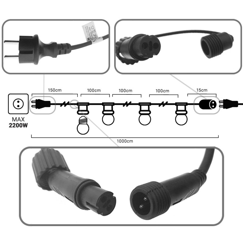 Kit ghirlanda luminosa per esterni 10 metri + 10 lampadine LED E27 1W - IP44 - Bianco caldo