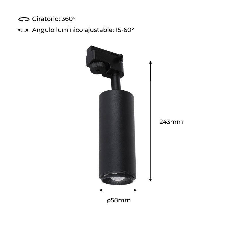 Evidenziate gli elementi e generate valore aggiunto con il faretto da binario ø58x243mm con angolo di luce regolabile e articolato da 8W in 2800K. Offre soluzioni per l'illuminazione di negozi, esercizi commerciali, esposizioni, ecc. È ideale per illuminare oggetti come borse, mobili, didascalie ecc. con una luce spot, che può essere regolata con un angolo di illuminazione compreso tra 15 e 60°. A questo scopo è necessario manipolare l'anello anteriore del faretto e spostarlo in direzione orizzontale. È inoltre dotato di un braccio articolato che può essere spostato di 180°. Con grado di protezione IP20, solo per uso interno. Disponibile in bianco e nero, è realizzato in alluminio di alta qualità. Offre un'illuminazione uniforme ed è certificata CE e RoHS, sinonimo di qualità e sicurezza.