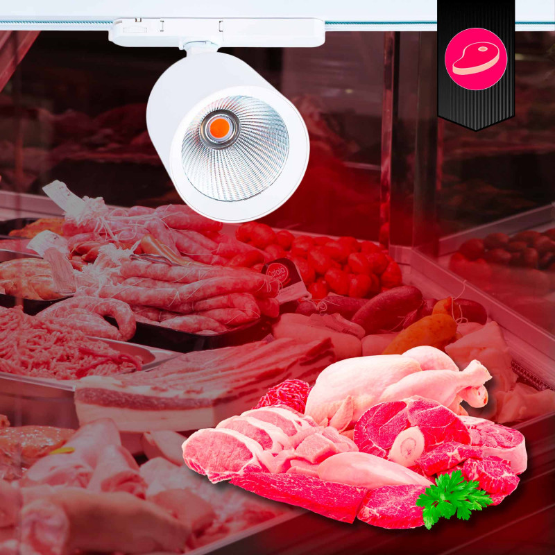 Faretto LED 40W a binario trifase per macelleria, dotato di uno speciale chip LED che intensifica il colore delle carni, garantendo un'illuminazione vibrante e attraente che invita all'acquisto.