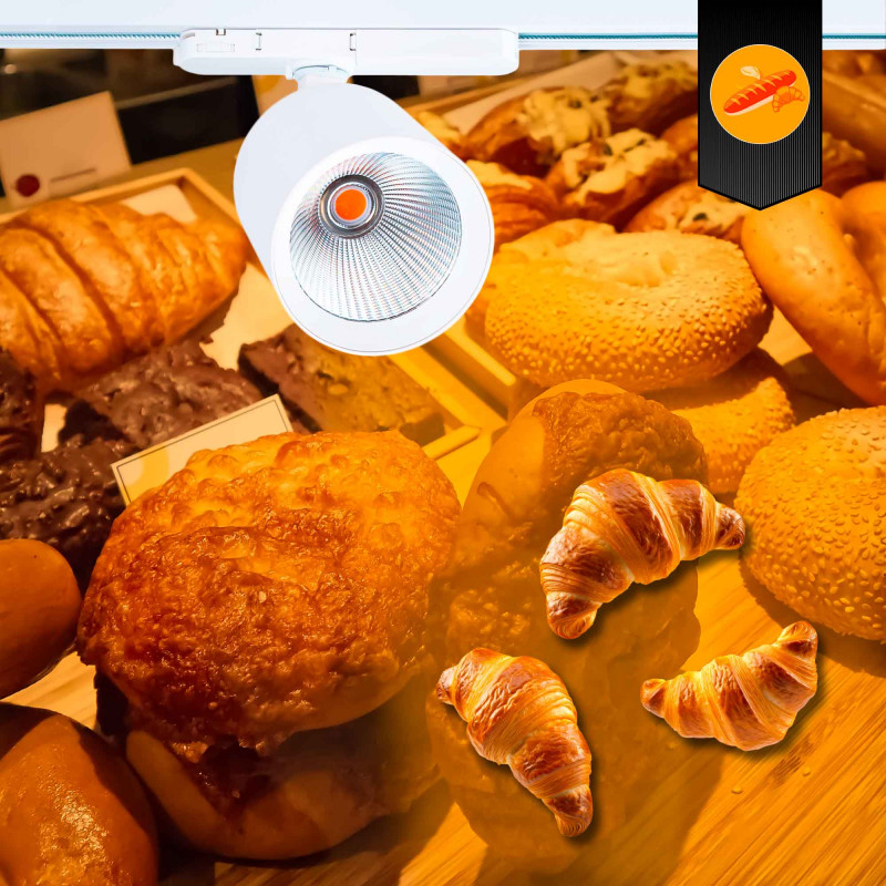 Questo faretto a binario LED trifase combina efficienza ed estetica, progettato appositamente per migliorare l'aspetto di pane e pasticceria, garantendo una presentazione accattivante e appetitosa per i clienti.