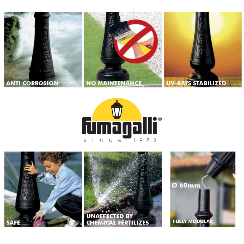 Offre la solidità di un palo in metallo con i vantaggi unici della resina: totale resistenza alla corrosione e all'ossidazione, nessuna manutenzione. Include due diffusori in stile classico, opale o trasparente.