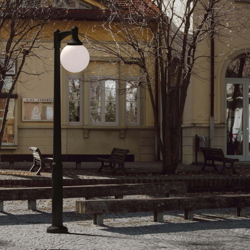- Diffusore a globo DOWN: Realizzato in PMMA opalino resistente ai raggi UV, mantiene la luminosità senza ingiallire nel tempo. Include un accessorio per direzionare la luce verso il basso.