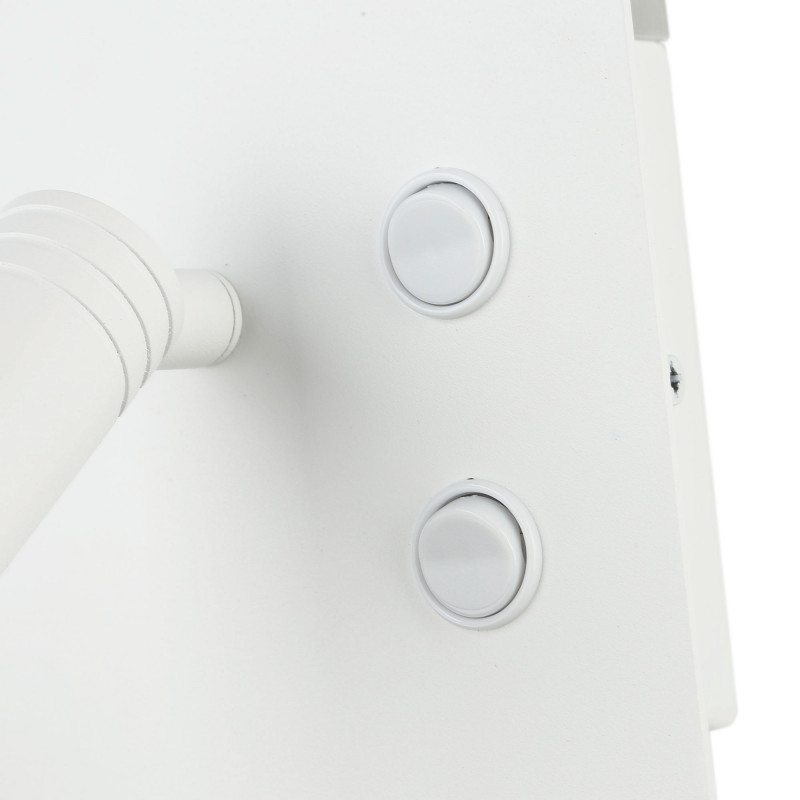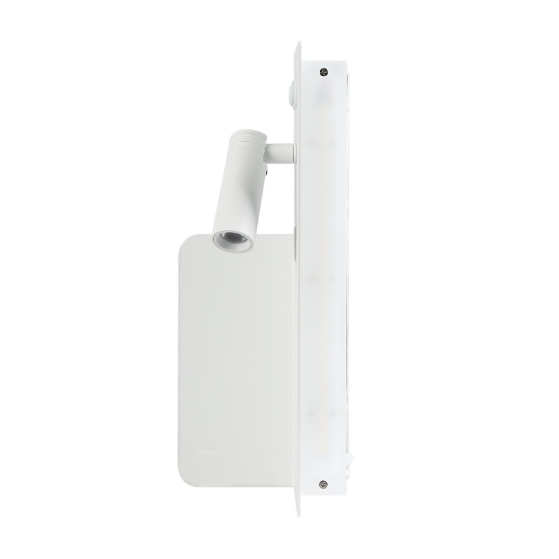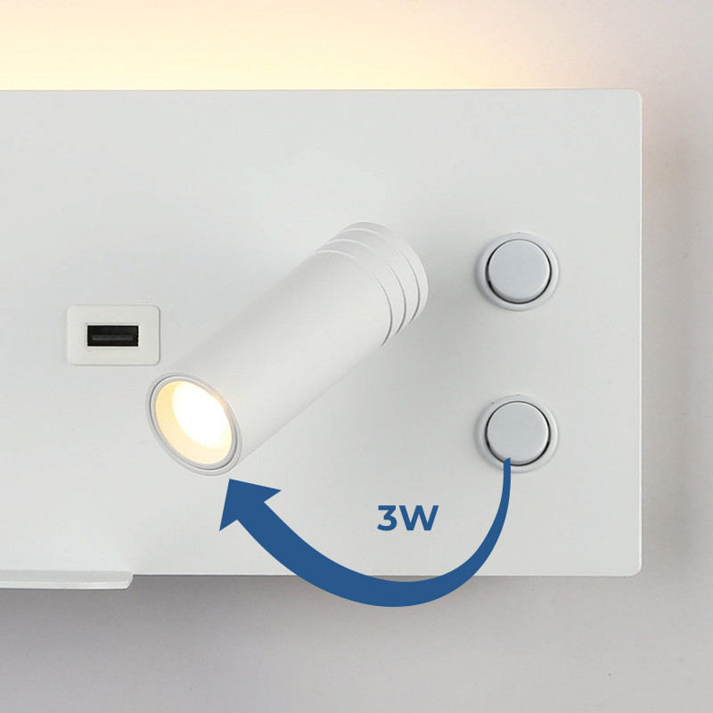 Incorpora un faretto orientabile da 3W che funge da lampada da lettura, situato sul lato destro dell'applique. Include anche un apparecchio perimetrale da 7W che fornisce un'illuminazione diffusa dell'ambiente.