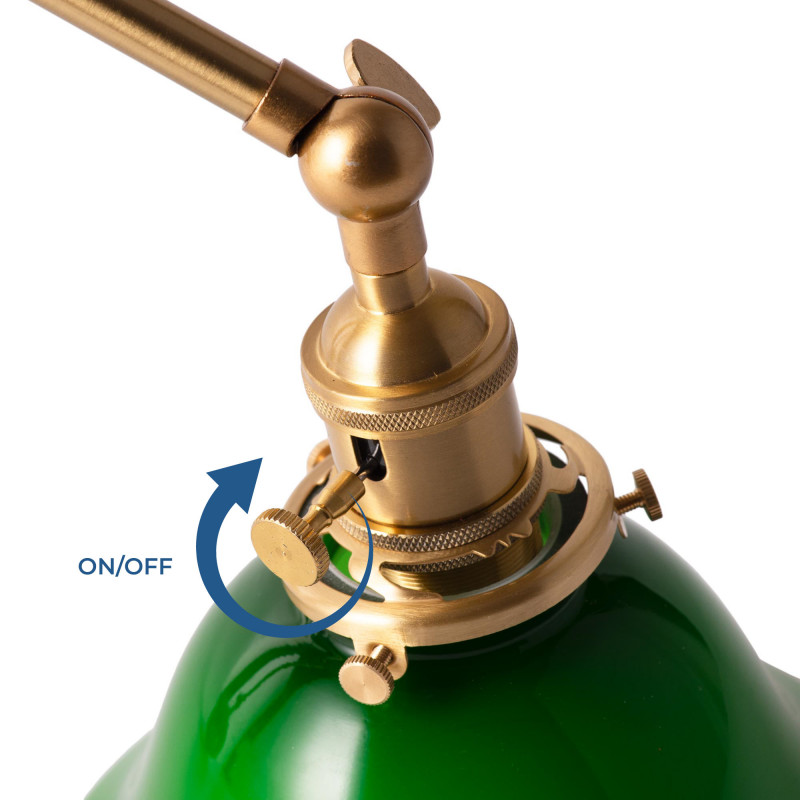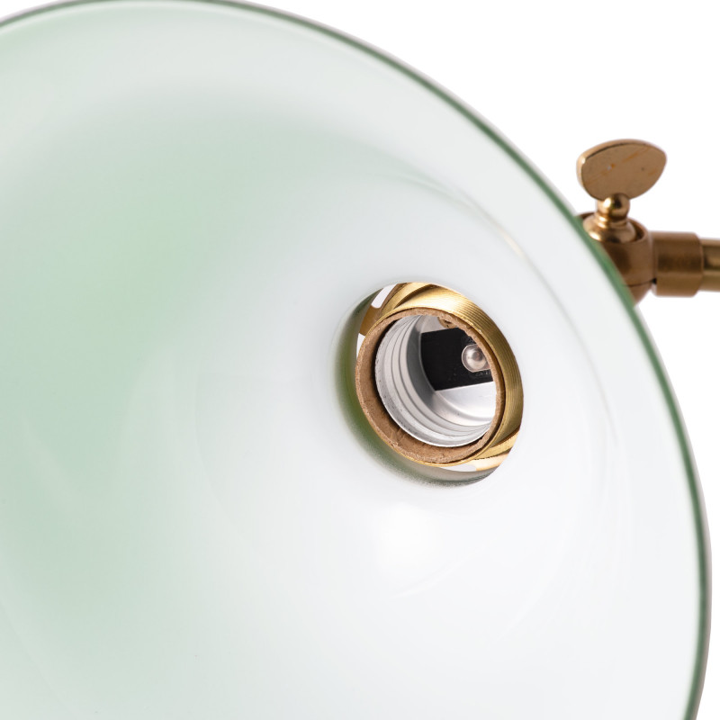- Design: Struttura in alluminio con finitura oro invecchiato che ne rafforza lo stile industriale vintage. Paralume in vetro verde.