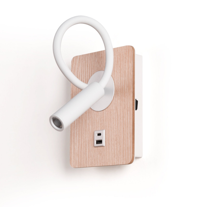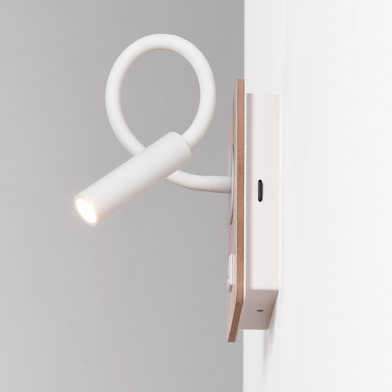 Progettata per essere installata accanto alla testiera del letto, questa lampada da parete offre una soluzione pratica per la lettura e la ricarica dei dispositivi senza occupare ulteriore spazio.