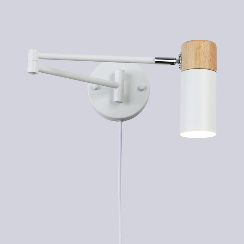 Applique in alluminio e legno dal design minimalista e dalle linee semplici ed eleganti. Ha un paralume cilindrico unito a una base circolare per mezzo di bracci articolati. Incorpora un portalampada per una lampadina LED E27 G45 (non inclusa).