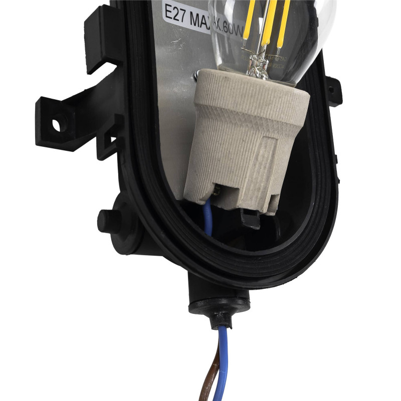 Perfetta per gli esterni, questa applique in policarbonato combina durata e design funzionale. Compatibile con lampadine E27 con diametro massimo di 60 mm, è ideale per illuminare giardini, garage, terrazze, facciate, corridoi o ingressi.