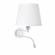 Questa lampada da parete si distingue per la sua doppia funzionalità, in quanto è dotata di un paralume in tessuto, con attacco E27, che consente un'illuminazione generale, e allo stesso tempo incorpora un apparecchio LED regolabile appositamente progettato come lampada da lettura. Entrambi gli apparecchi si accendono o si spengono tramite interruttori indipendenti.