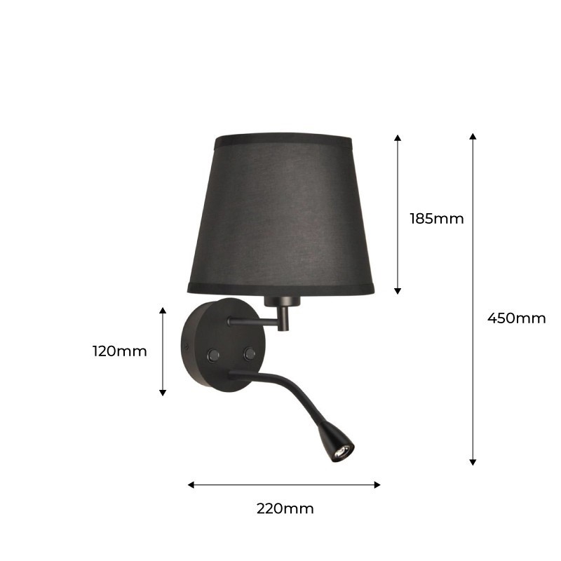 Ha un elegante paralume in tessuto e incorpora un faretto LED regolabile da 3W che funziona come lampada da lettura. In questo modo, permette di scegliere tra l'illuminazione generale del paralume e la luce spot del suo faretto LED tramite due interruttori indipendenti.