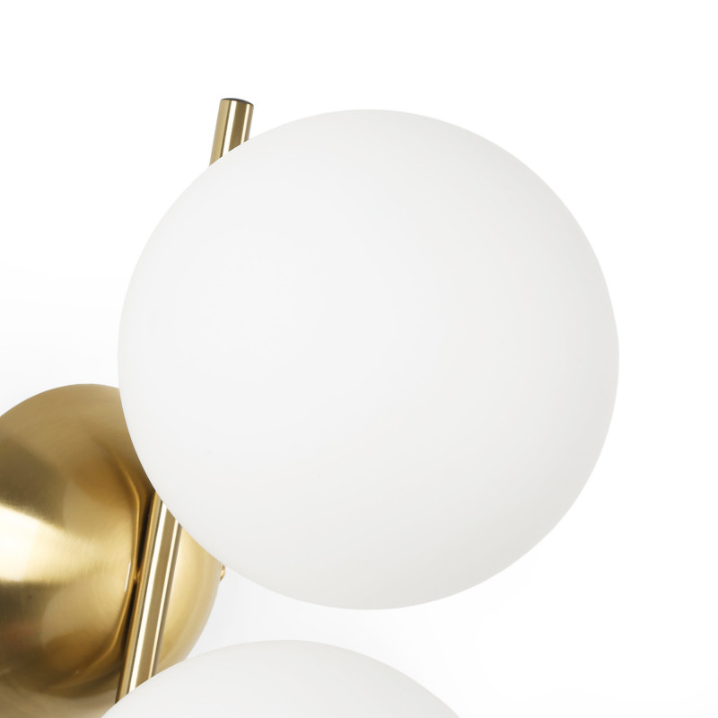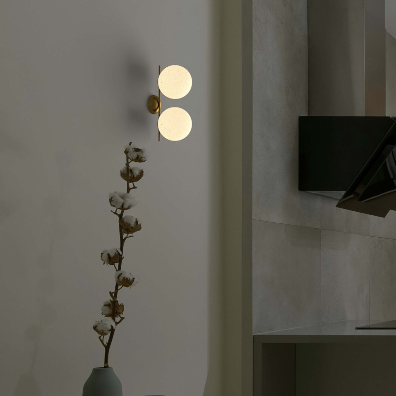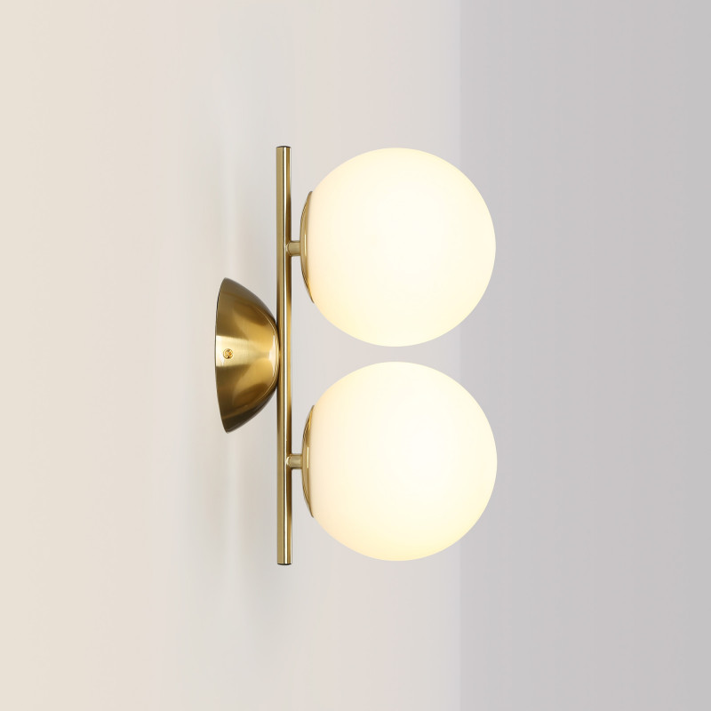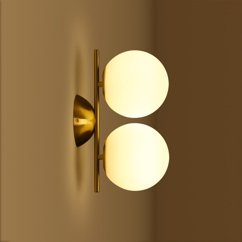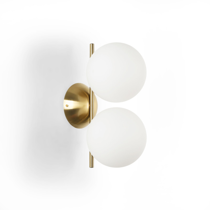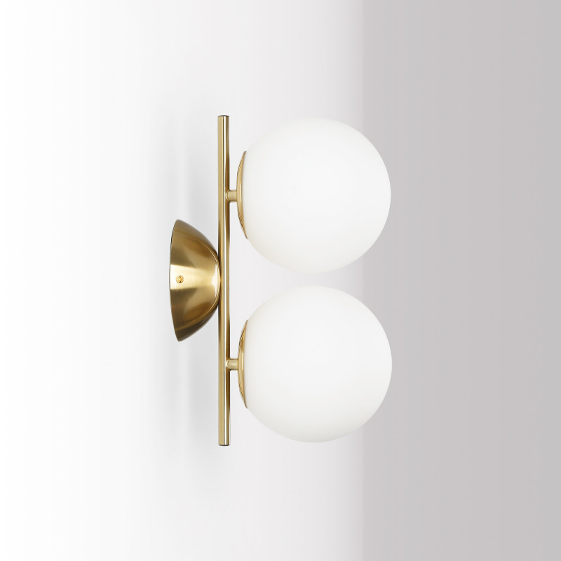- Design minimalista: composta da due sfere di vetro opalino in equilibrio su una struttura in alluminio con finitura cromata o dorata. Si adatta perfettamente a interni classici, retrò o moderni.