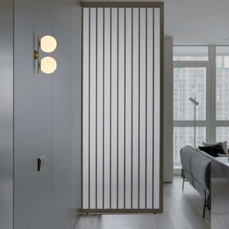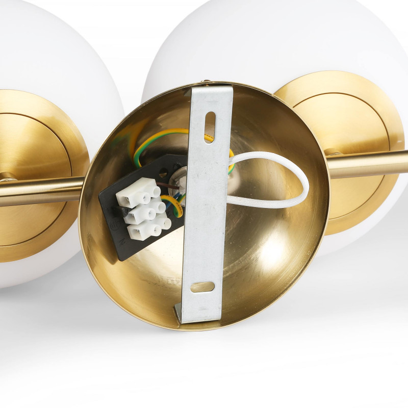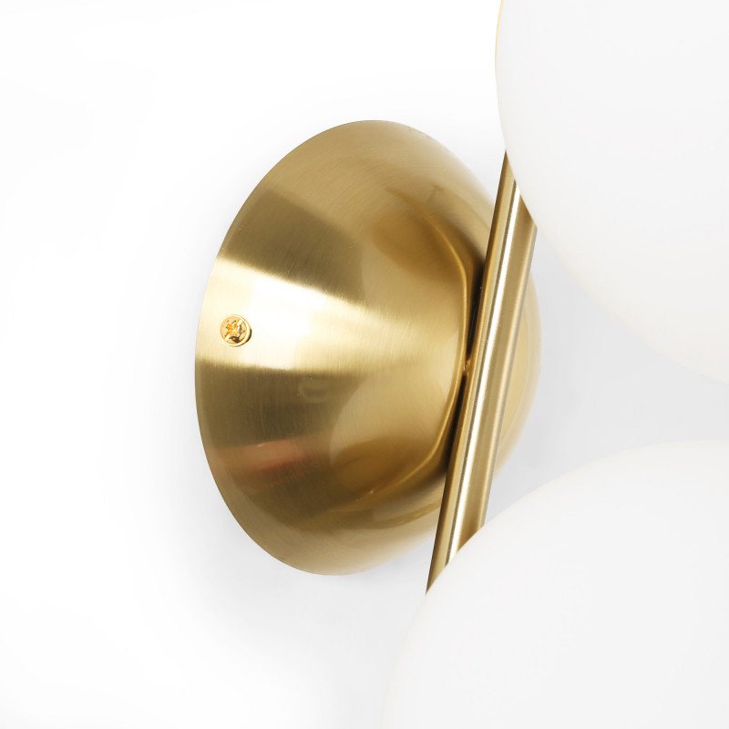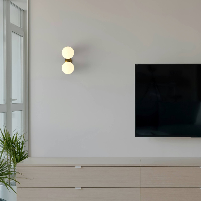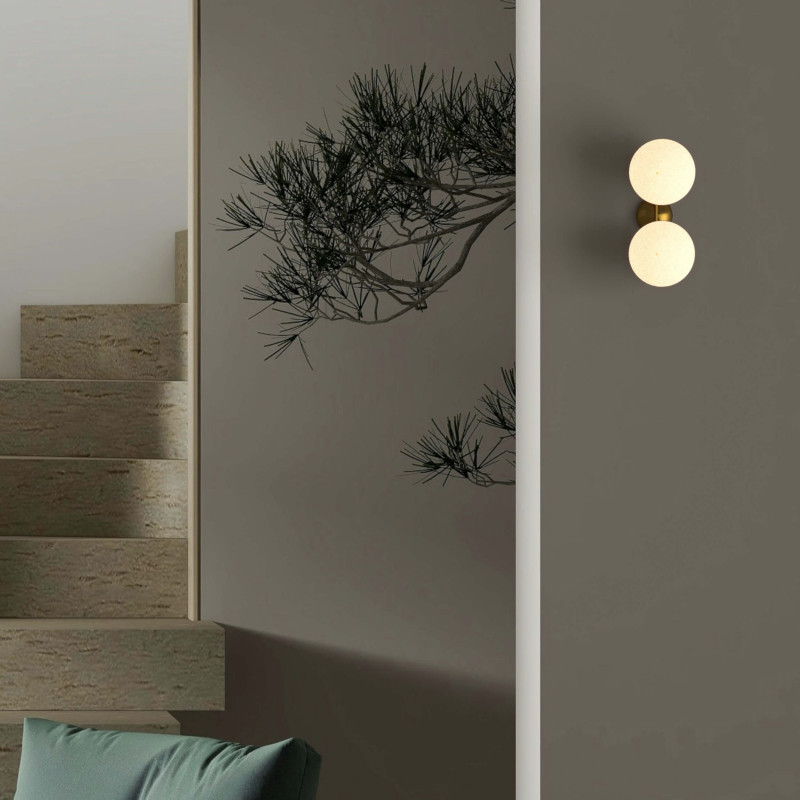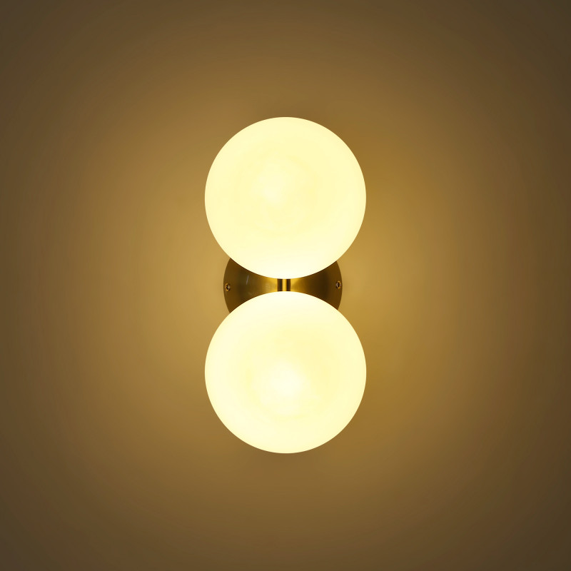 - Design minimalista: composta da due sfere di vetro opalino in equilibrio su una struttura in alluminio con finitura cromata o dorata. Si adatta perfettamente a interni classici, retrò o moderni.