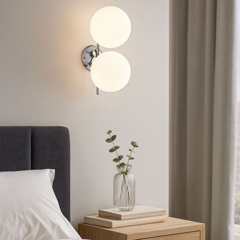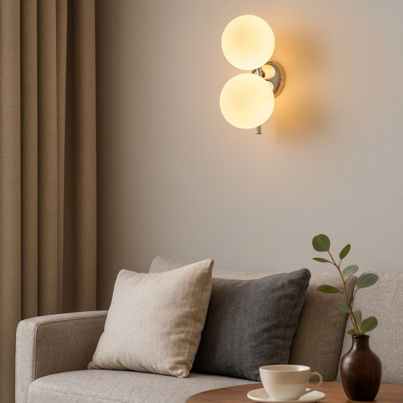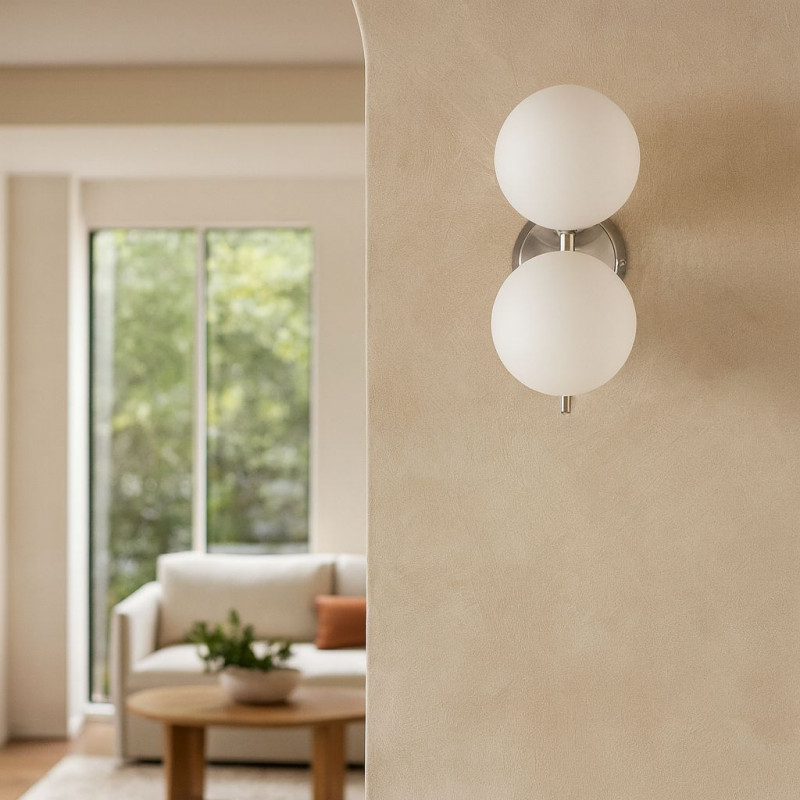 - Design minimalista: composta da due sfere di vetro opalino in equilibrio su una struttura in alluminio con finitura cromata o dorata. Si adatta perfettamente a interni classici, retrò o moderni.