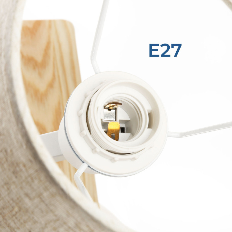 Ha una base in alluminio laccato bianco, un elegante paralume in tessuto beige e una mensola in legno naturale.