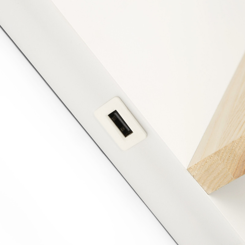La lampada da parete incorpora una porta USB e una base in legno per sostenere il telefono cellulare, consentendo una pratica ricarica durante la notte.