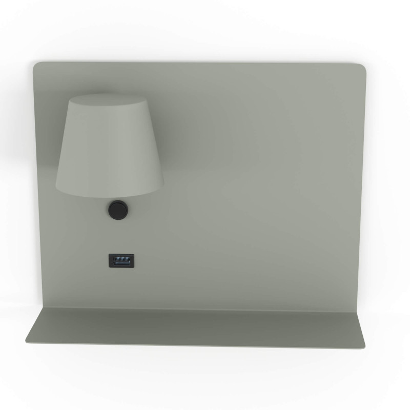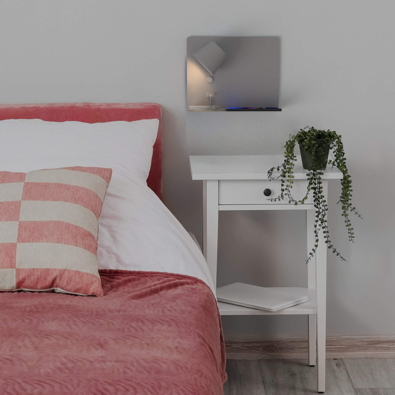 Moderna applique da parete appositamente progettata per essere installata nelle testiere dei letti, con porta USB e mensola integrata.