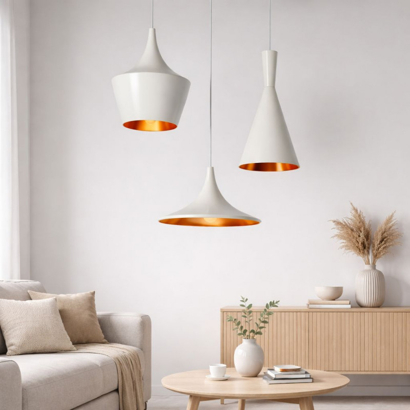 È composta da tre lampade a sospensione di diverso design, regolabili in altezza, disponibili in finitura nera o bianca con interni dorati, una combinazione che le conferisce un aspetto sofisticato e contemporaneo.
