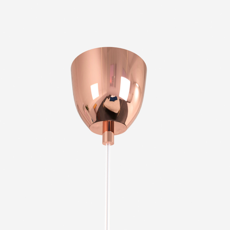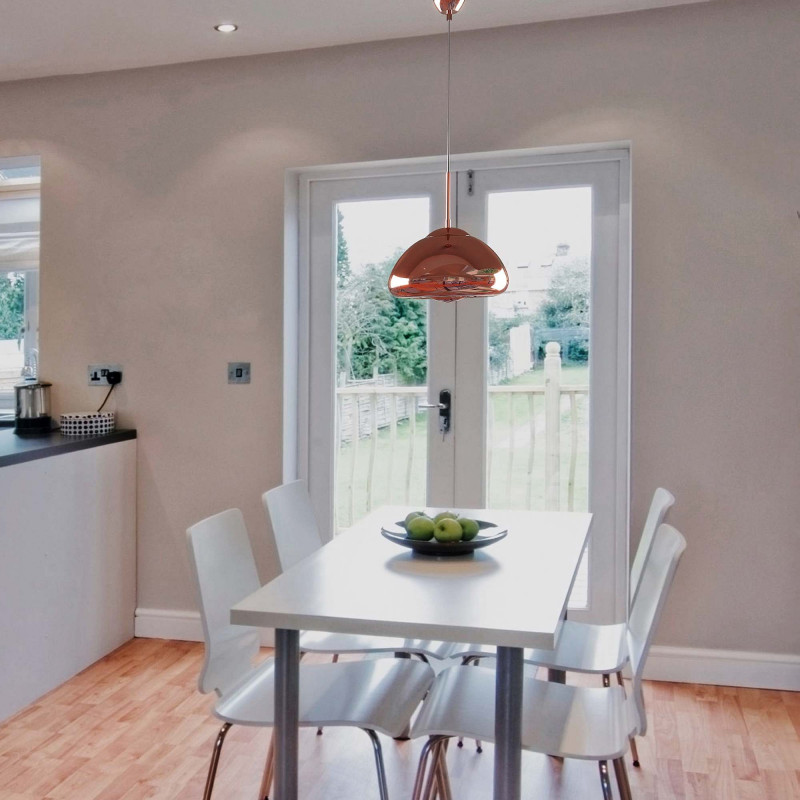 La parte esterna del paralume è in vetro, disponibile in 3 colori: cromo, rame e oro, e permette alla luce di essere catturata e riflessa in modo magnifico, creando uno splendido effetto scintillante.