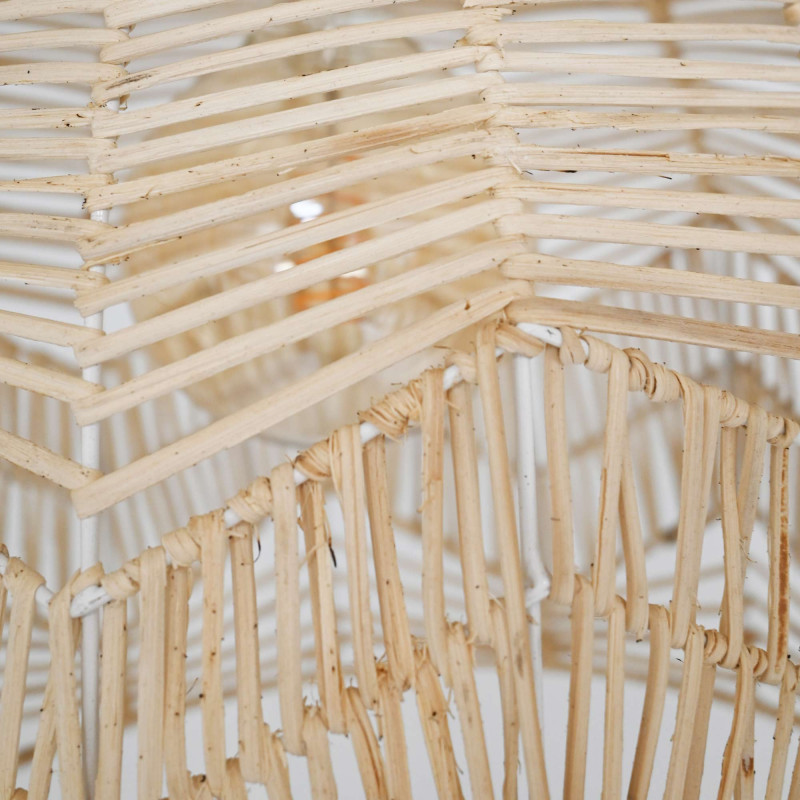 Lampada a sospensione "NORMA", realizzata a mano in vimini con finiture di alta qualità. La sua trama diffonde la luce in modo caldo e sottile, esaltandone la consistenza.
