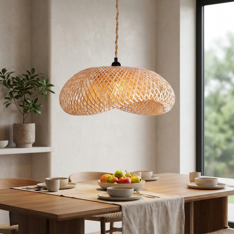 La sua trama permette alla luce di diffondersi delicatamente, esaltando le texture del vimini e dando vita a un clima rilassato e armonioso.