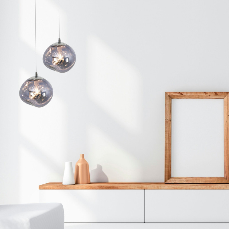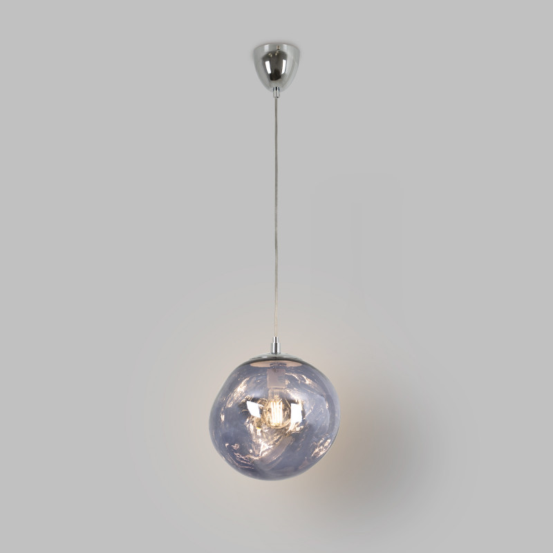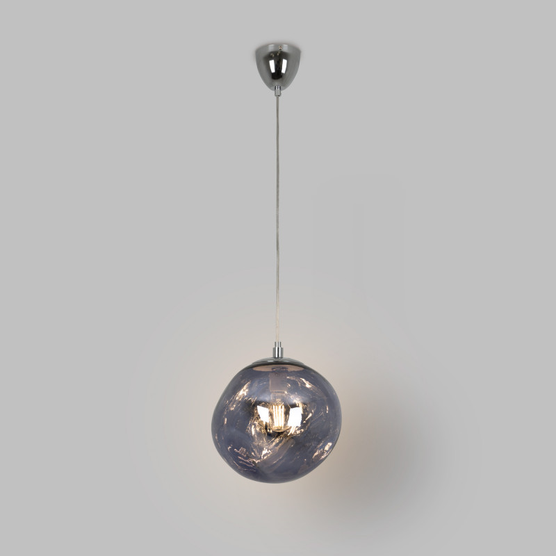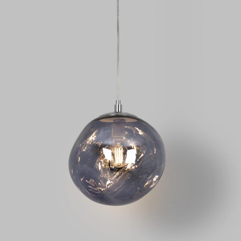 Lampada a sospensione d'avanguardia con un paralume che evoca la fusione di materiali allo stato fluido, creando un'esperienza visiva accattivante.
