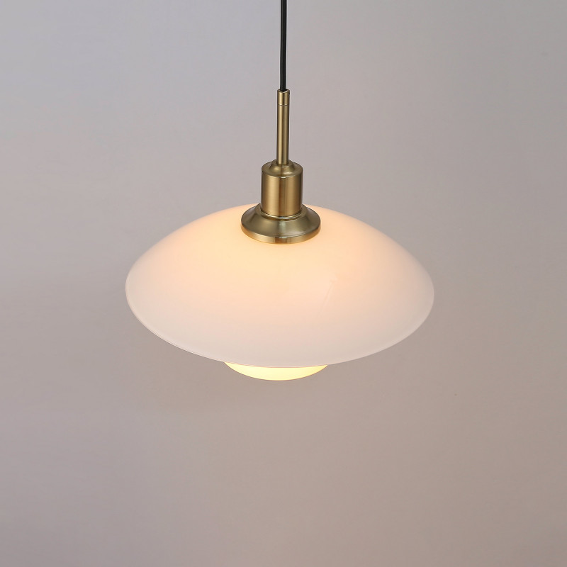 Lampada a sospensione dal design raffinato con triplo paralume in vetro opalino e dettagli in alluminio dorato o cromato.