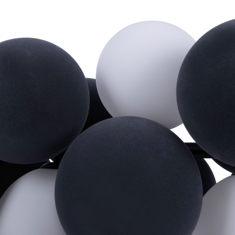 Le sfere luminose sono realizzate in vetro opalino e offrono una luce soffusa e avvolgente, trasformando lo spazio in un'atmosfera accogliente e moderna.