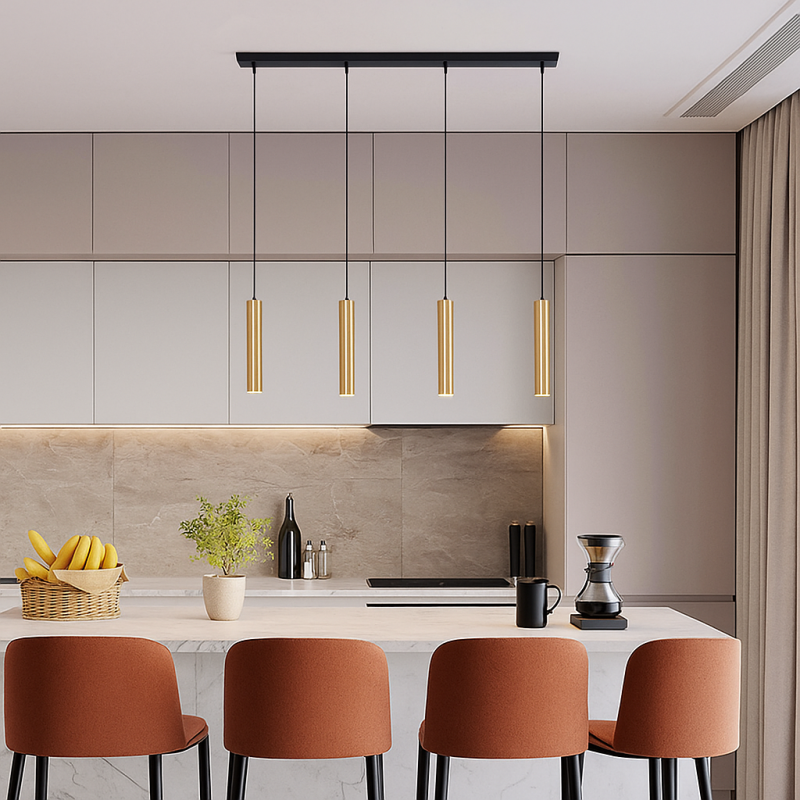 Questa lampada quadrupla presenta un design tubolare moderno e minimalista, ed è perfetta per l'illuminazione mirata di aree specifiche come tavoli, bar e cucine.