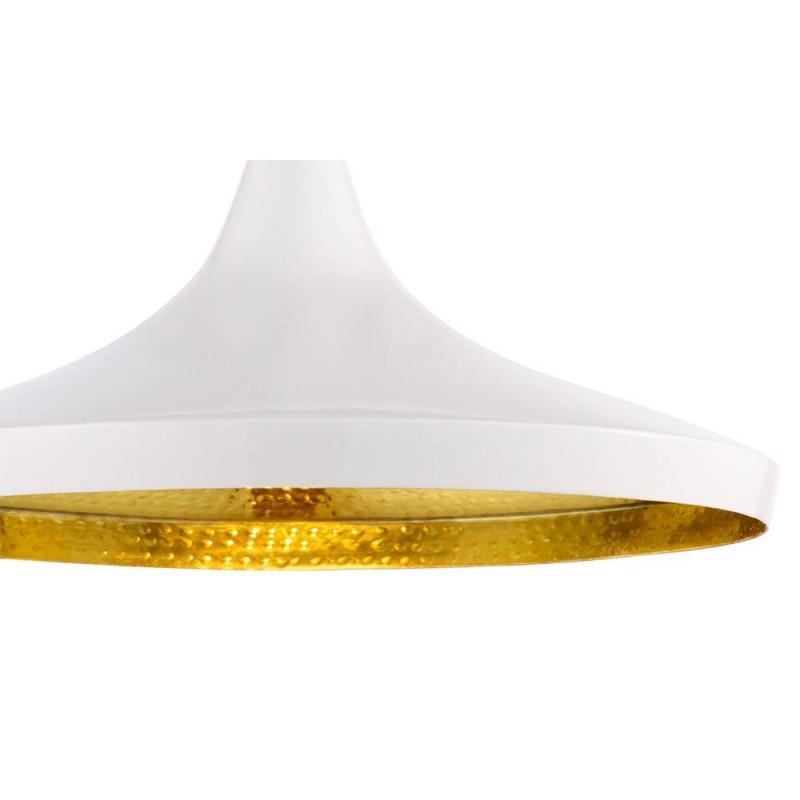 Ha un paralume in alluminio con finitura opaca, disponibile in bianco o nero, con interno color oro.