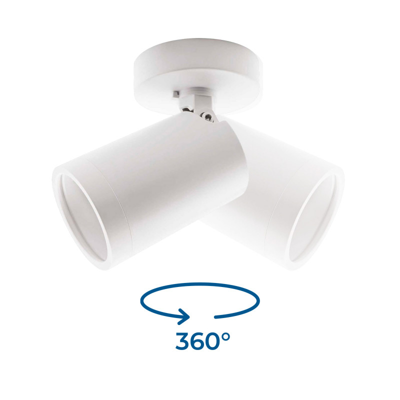 Montaggio della superficie. Presa per lampadine GU10 LED fino a 20W. Esclusivo per uso interno con grado di protezione IP20. Può essere orientato in qualsiasi direzione.