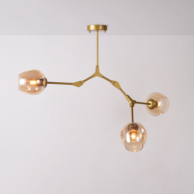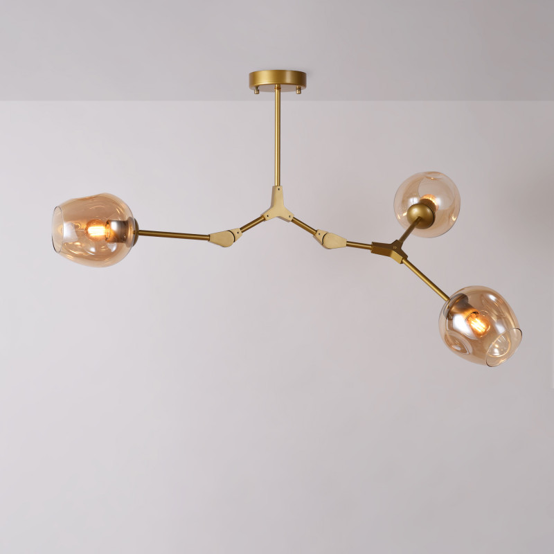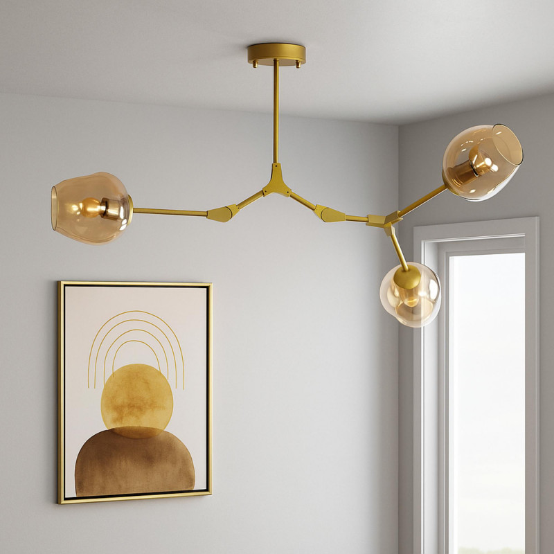 Questa lampada a sospensione si distingue per il suo design moderno e geometrico, perfetto per chi cerca un'illuminazione decorativa di carattere. La sua struttura metallica articolata e i tre paralumi in vetro conferiscono raffinatezza a qualsiasi ambiente, da soggiorni e sale da pranzo a spazi di lavoro o locali commerciali.