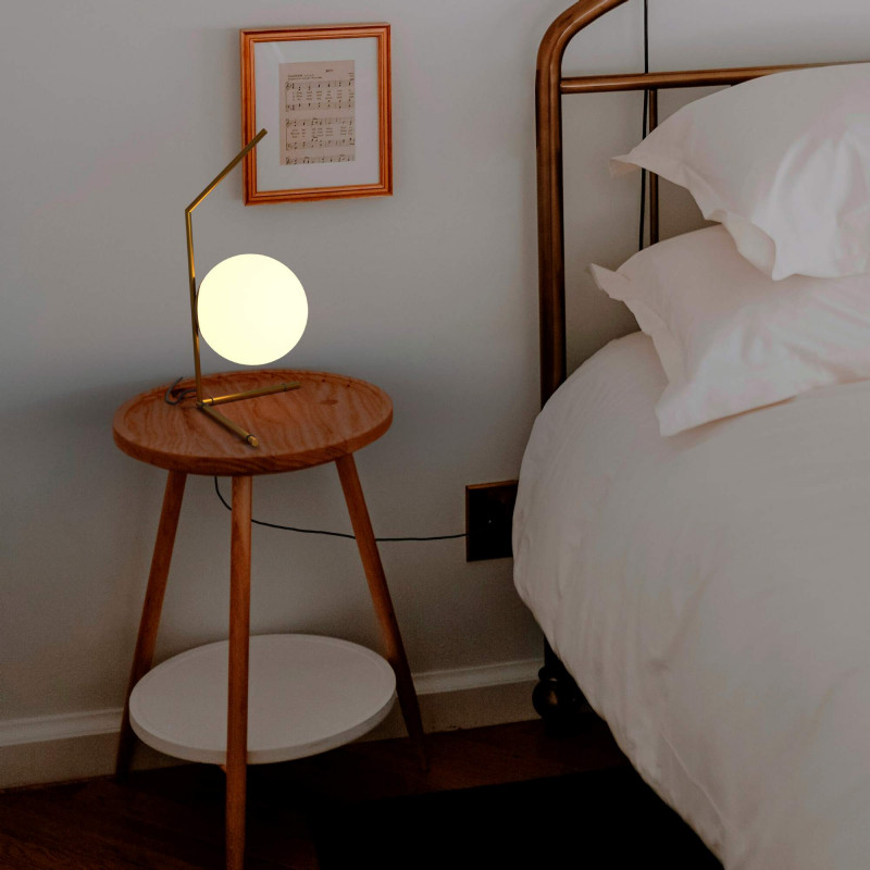 La lampada da tavolo "Octo" ha una struttura in alluminio color oro opaco dall'accattivante forma angolare, sulla quale il paralume sferico in vetro opalino fornisce un'illuminazione brillante e omogenea.