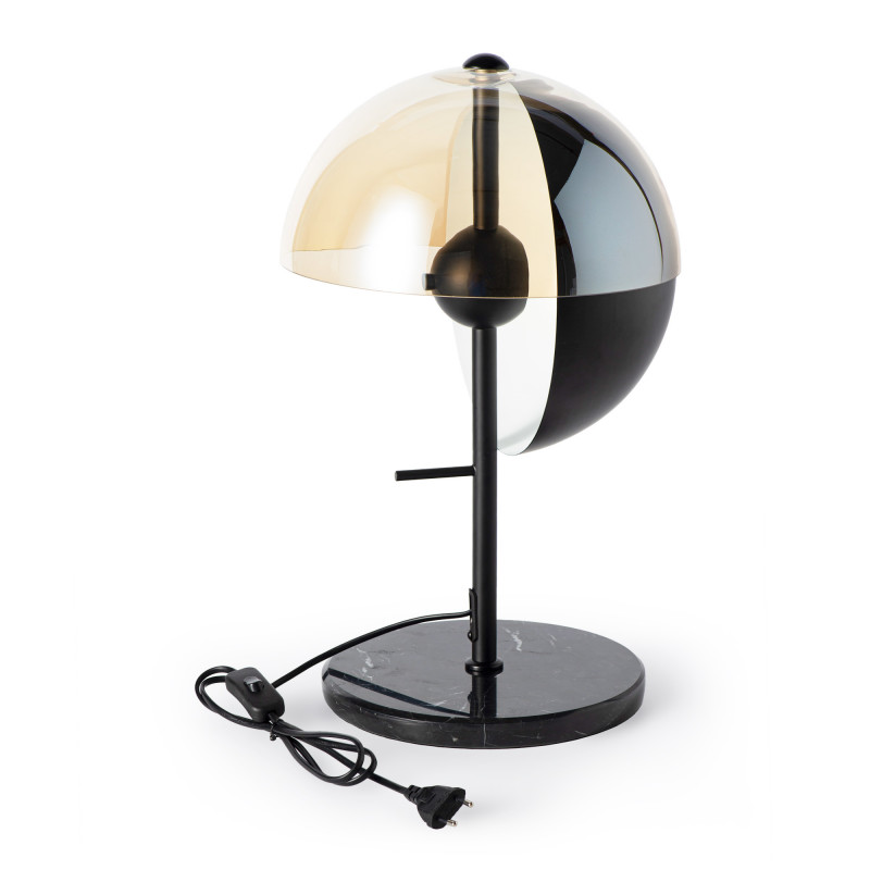 - Design sofisticato: ha un paralume sferico in vetro fumé con effetto ambrato, montato su una solida base in marmo. Un design elegante che aggiunge carattere e presenza a qualsiasi ambiente.