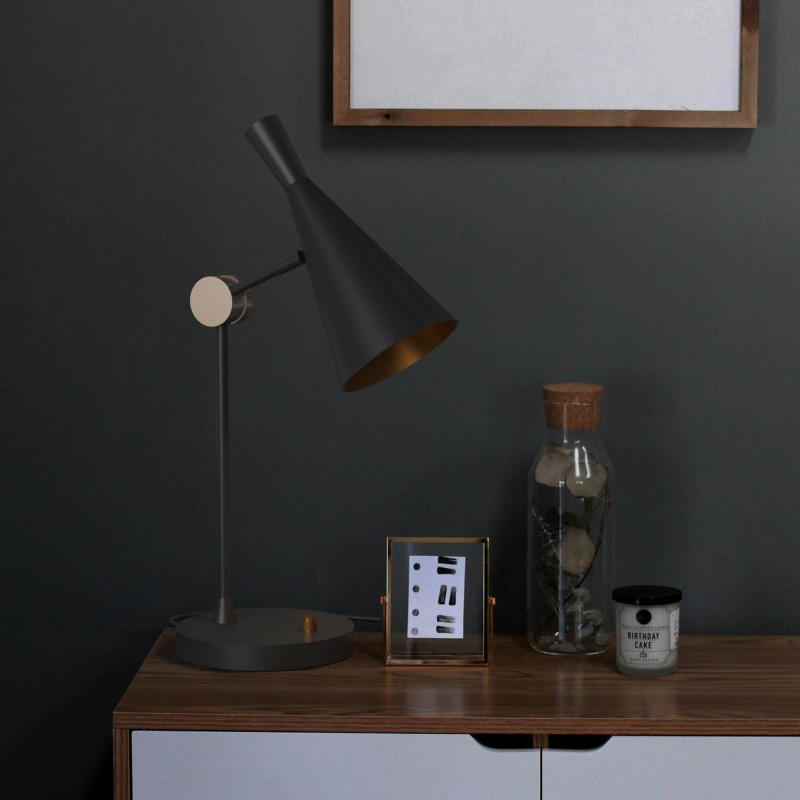 La lampada da tavolo "Nordi" presenta un design contemporaneo e una struttura in alluminio nero con finitura opaca.