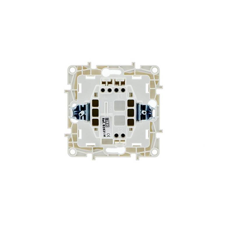 Meccanismo con funzione di commutatore costituito da un singolo elemento a 1 via. Il commutatore è progettato per il montaggio a incasso in una scatola di dimensioni standard. I cavi sono fissati al meccanismo mediante terminali a innesto rapido senza viti.