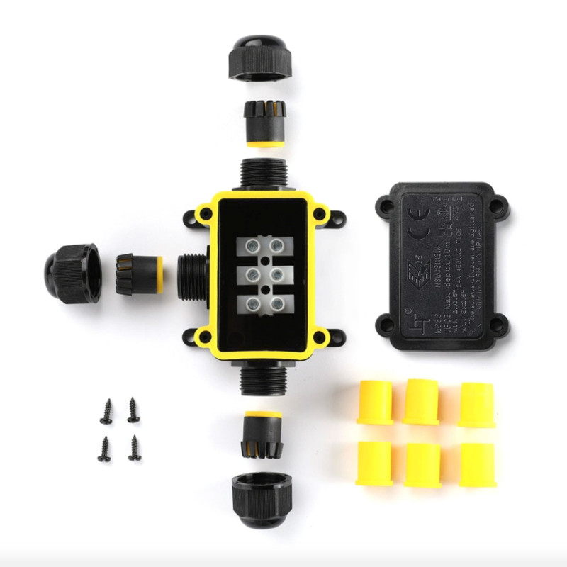 La scatola di giunzione a T impermeabile con grado di protezione IP68 è progettata per garantire una giunzione sicura in ambienti difficili. Ideale per l'uso in esterni, è sommergibile e resistente a polvere e umidità.