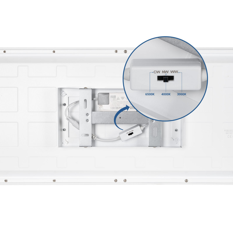 - Tonalità regolabile: sistema CCT per la regolazione della temperatura di colore tra: bianco caldo (3000K), bianco neutro (4000K) e bianco freddo (6500K). Il controllo avviene tramite un interruttore incorporato nel pannello.