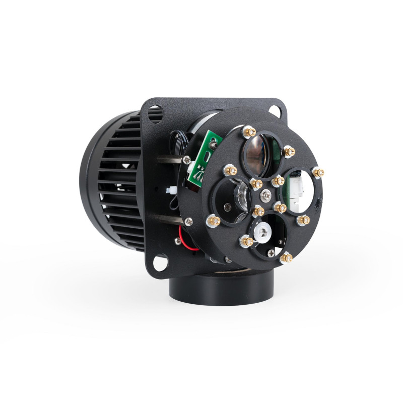- Telecomando: consente di accendere e spegnere il proiettore e di gestire il cambio delle lenti con diverse opzioni: cambio manuale, cambio ogni un tempo predefinito o cambio automatico con spegnimento del proiettore tra un cambio e l'altro. Le batterie del telecomando non sono incluse.