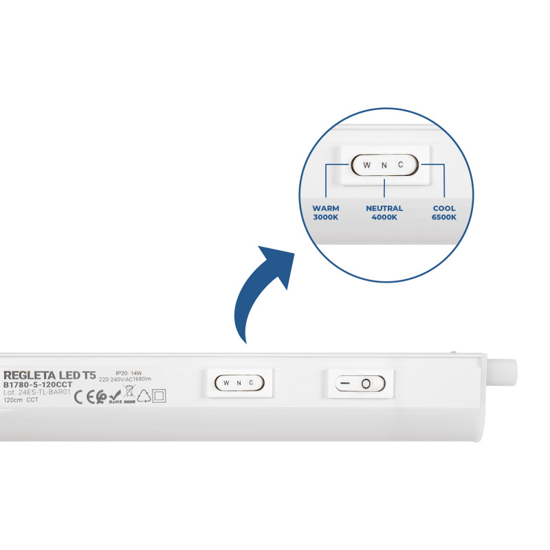 - Tonalità regolabile: con un sistema CCT che utilizza un selettore per scegliere tra tre temperature di colore: bianco caldo (3000K), neutro (4000K) e freddo (6500K).