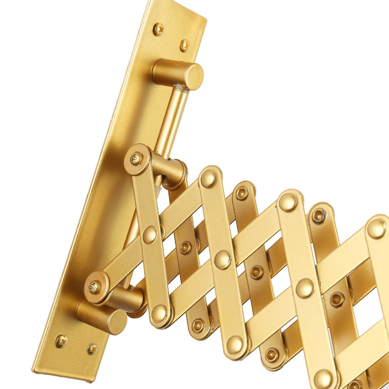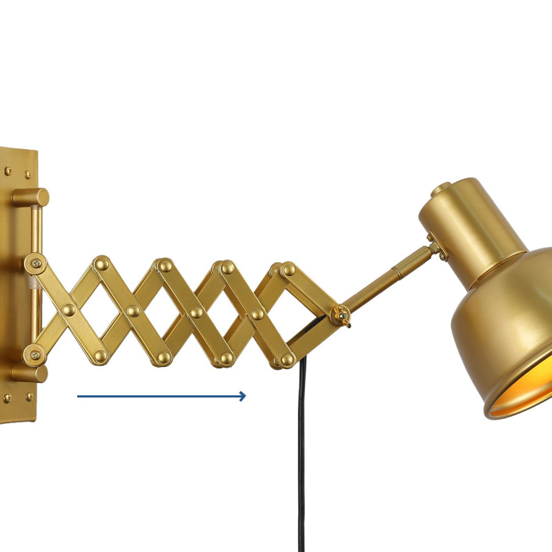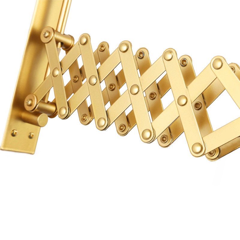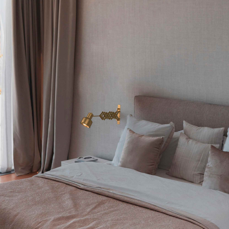 Aplique de pared "ROMA" con fuelle extensible hasta 48 cm y cabezal orientable 300°, que permite una gran versatilidad a la hora de direccionar la luz. La ballesta en forma de tijera se recoge (mínimo 30 cm) y se extiende (máximo 48 cm).