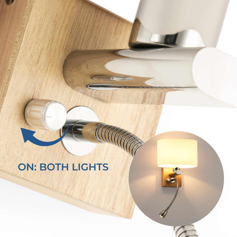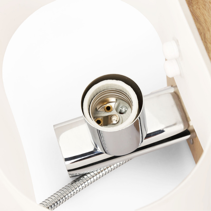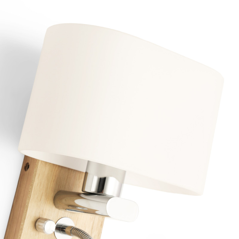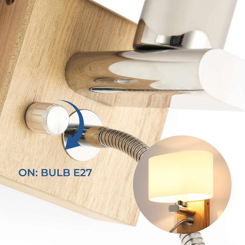 El interruptor integrado en la estructura de madera enciende por separado el foco led de 3W y la bombilla E27 (no incluida).