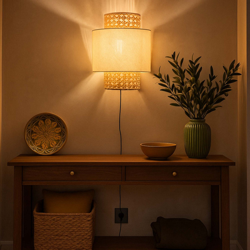 - Iluminación decorativa: Pantalla de mimbre y tela permite que la luz se filtre de forma cálida y uniforme, creando un ambiente acogedor.