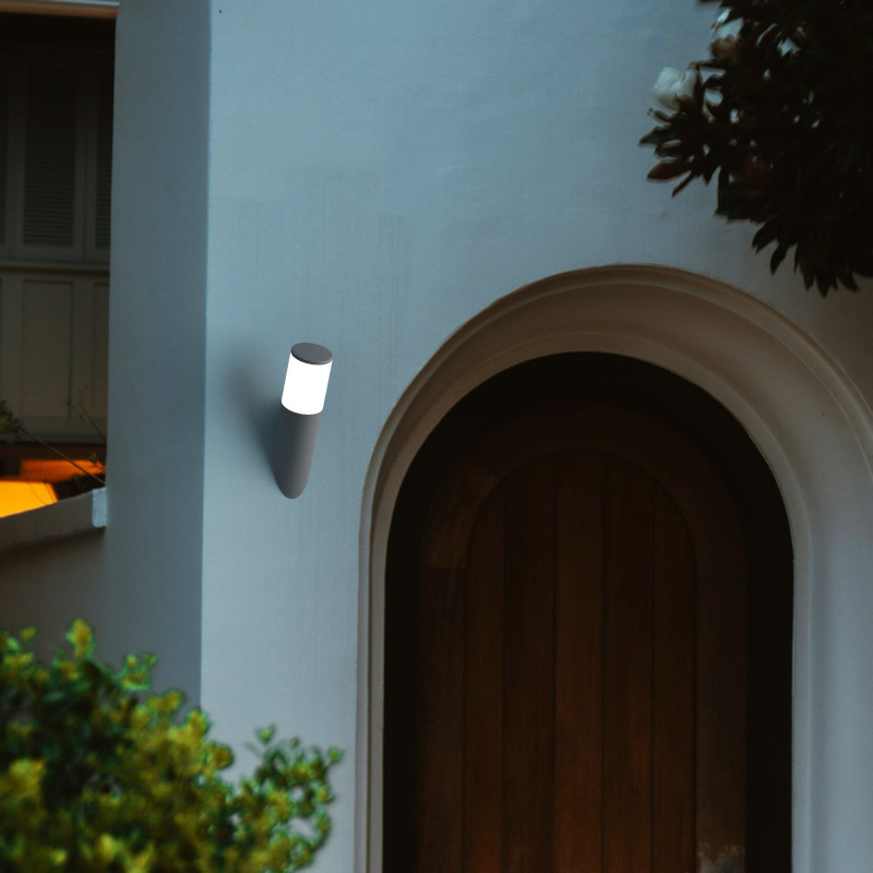 Aplique exterior tubular inclinado de la firma italiana FUMAGALLI, de gran diseño y calidad. Está fabricado en resina resistente a golpes, corrosión y degradación por rayos UV. Por su grado de protección IP55 es apto para exterior.
