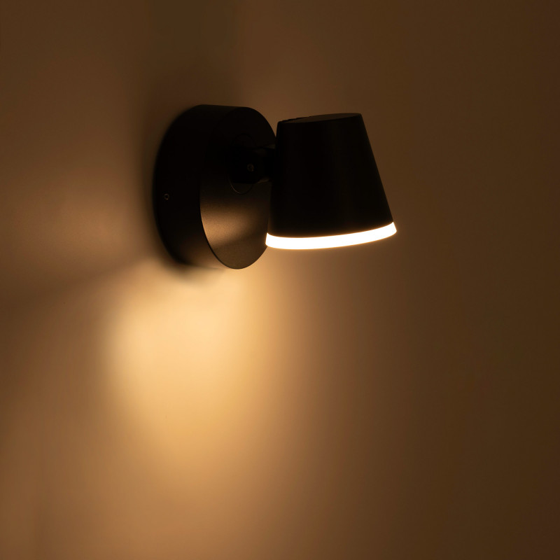 El aplique de exterior LED "Stan" cuenta con un cuerpo de aluminio en acabado negro mate, orientable de acuerdo a las necesidades de cada espacio. Además, incorpora un difusor de policarbonato opal que expande la luz de manera suave y homogénea.
