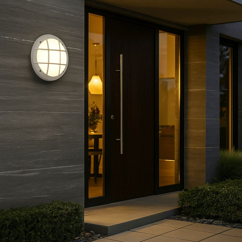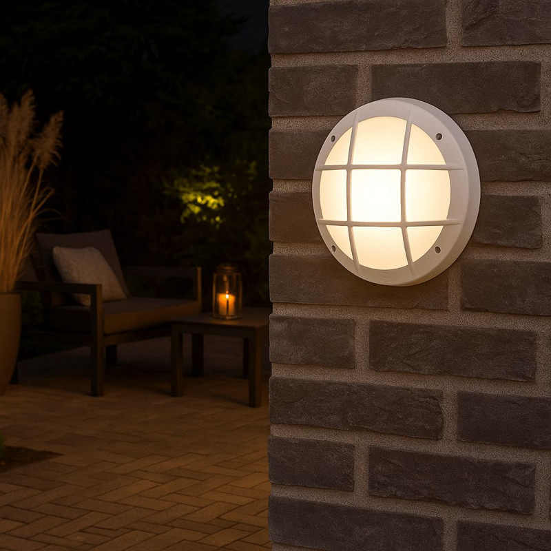 Lámpara tipo aplique náutico de forma redondeada realizada en material de resina a prueba de golpes, resistente a la oxidación, corrosión y a los rayos UV. Cubierta con rejilla decorativa. Ideal para ser montada en la pared y en el techo. Clase de aislamiento II, grado de protección IP66.