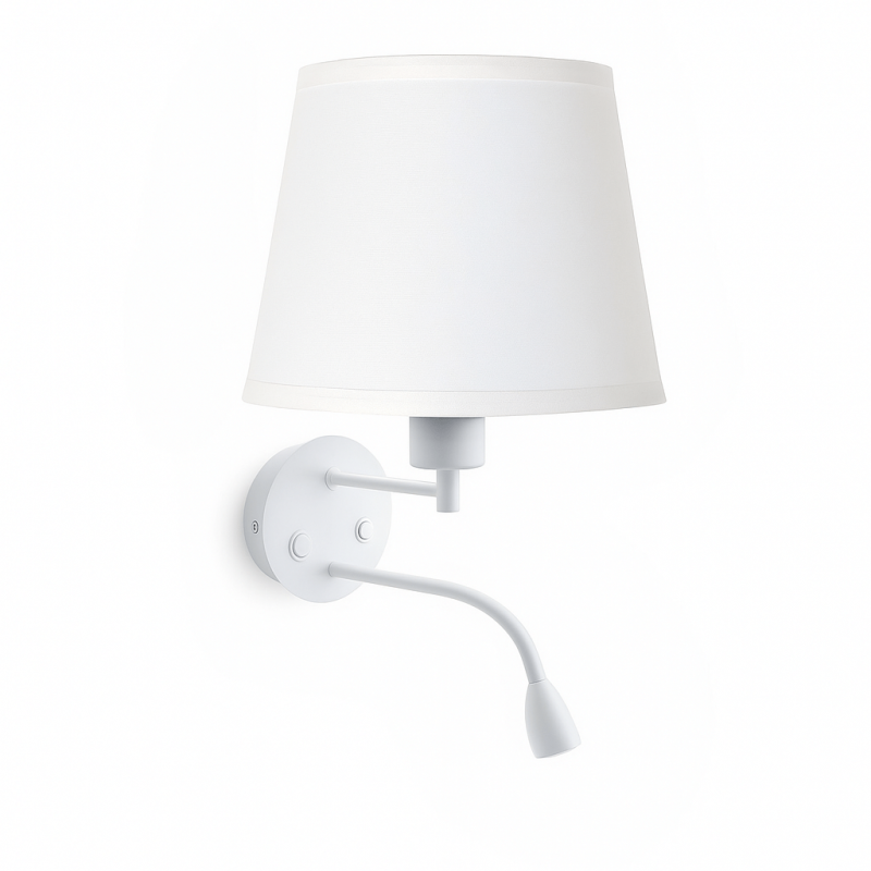 Este aplique de pared se destaca por presentar una doble funcionalidad, ya que cuenta con una pantalla de tela, con casquillo E27, que permite una iluminación general, y a la vez incorpora una luminaria orientable LED especialmente diseñada como foco de lectura. Ambas luminarias se encienden o apagan mediante interruptores independientes.