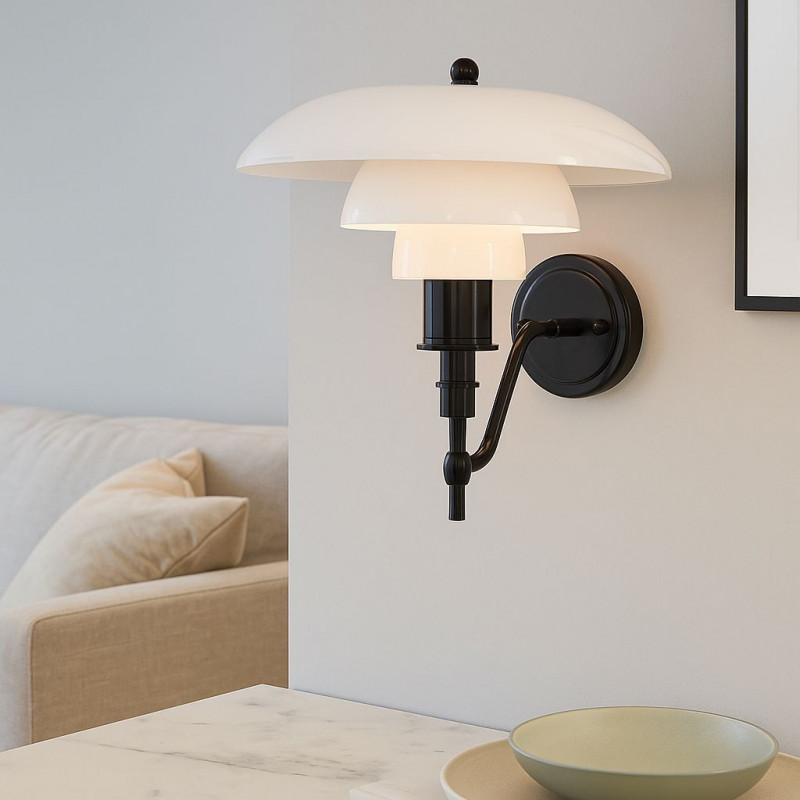 Lámpara de pared de diseño exquisito, con triple pantalla de cristal opal y base en aluminio.