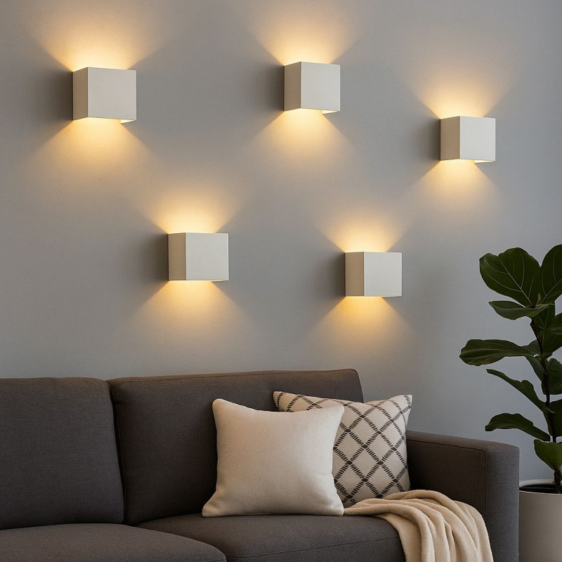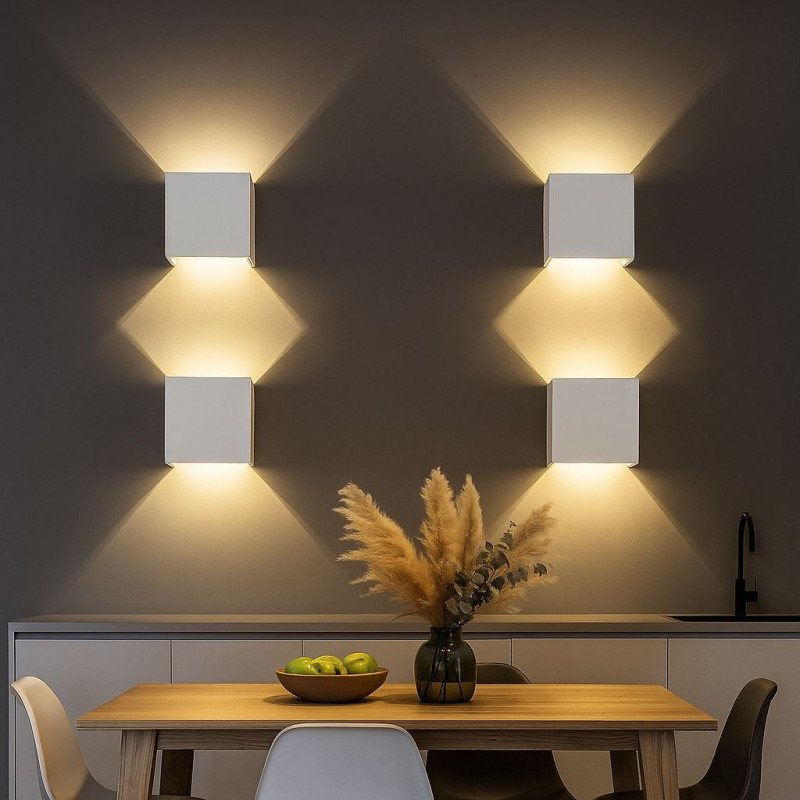 Aplique de pared de 6W. Con un diseño de cubo elegante y minimalista. Se puede ajustar la apertura de luz desde dos aletas que se gradúan en su interior, estas se pueden girar para graduar el ángulo de la cantidad de luz que se quiera emitir. El ángulo de haz máximo es de 100 grados. El aplique de pared está formado por un chip COB de alta calidad, que se caracteriza por su bajo consumo de energía y es utilizado normalmente en iluminación y decoración de interiores y exteriores.