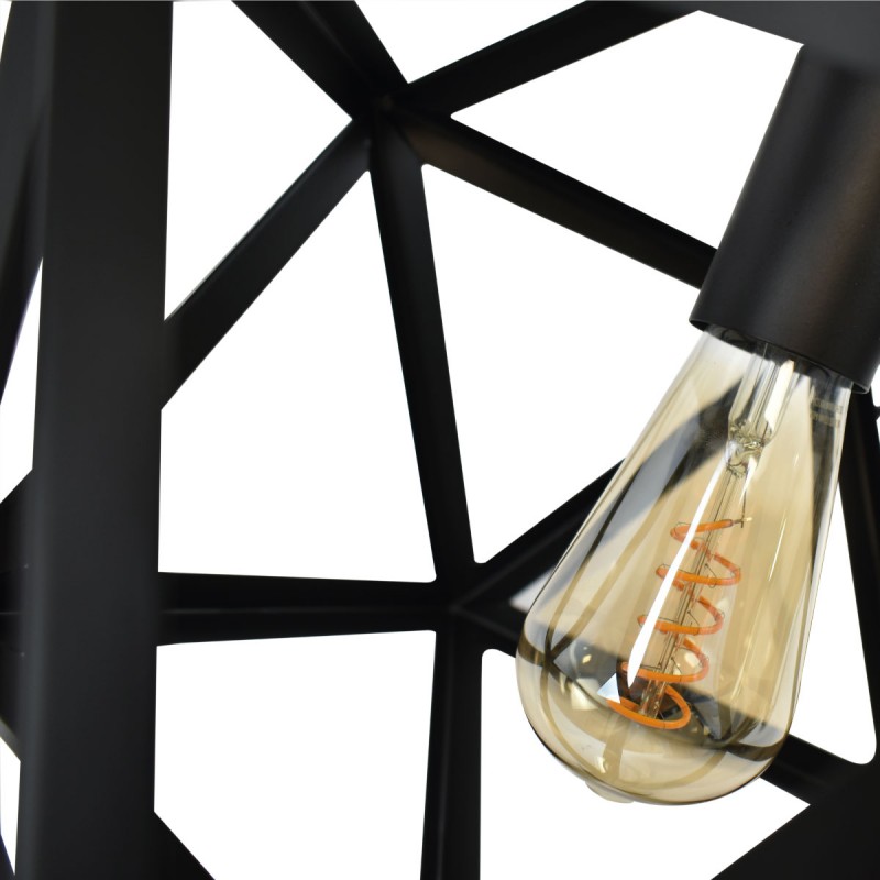 Lámpara colgante de estilo geométrico, muy decorativa y visualmente impactante. Es perfecta para su montaje en bares, cafeterías y restaurantes. Fabricada en metal y lacada en color negro. Dispone de casquillo para bombilla E27.